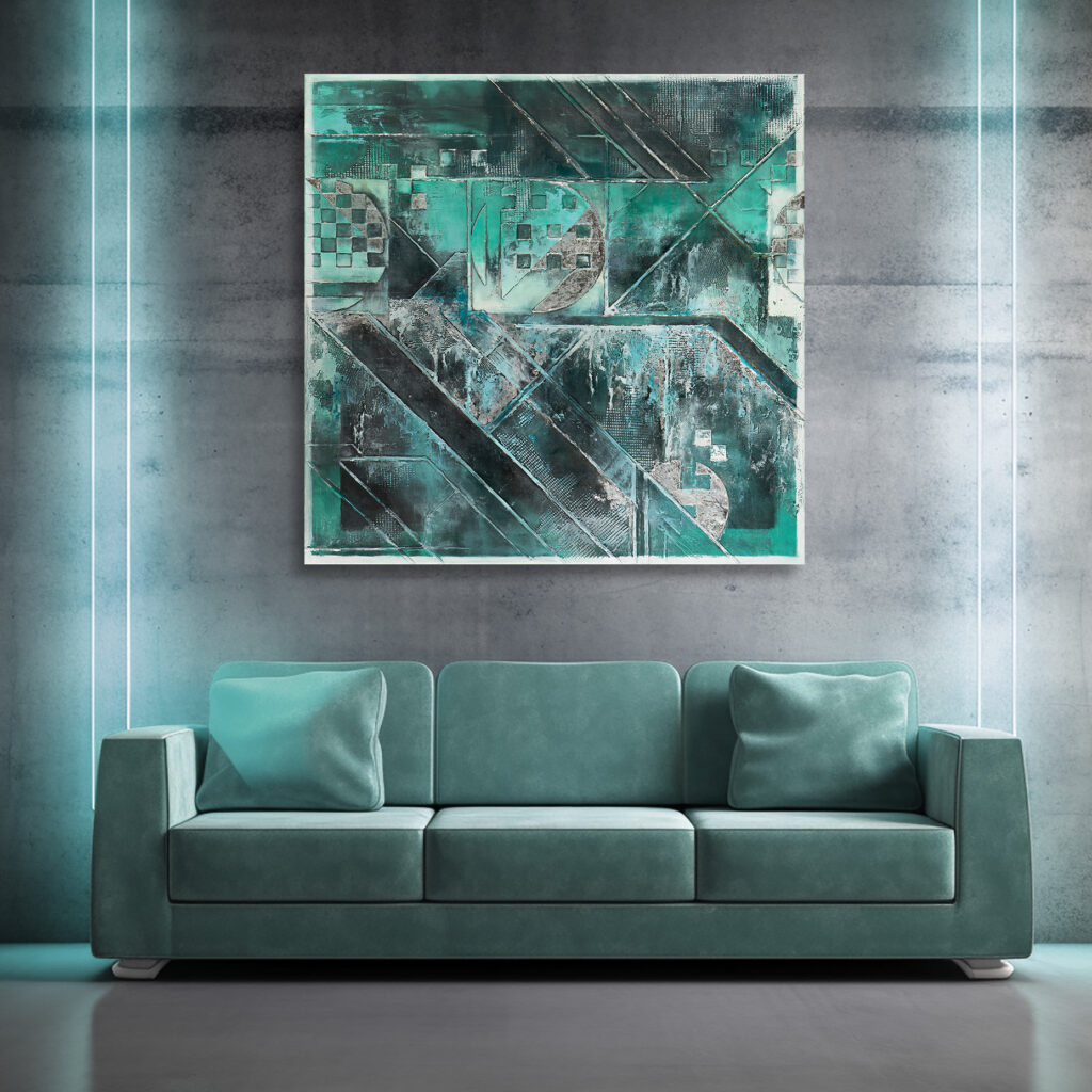Obraz jest przestrzenny, wysoka jakość pigmentów i użytych materiałów gwarantuje najwyższy poziom prezencji. Obraz jest dobrze zabezpieczony i można go łatwo wyczyścić mokrą ścierką. Srebrny szlagmetal pięknie kontrastuje z głębokimi kolorami kolorami czerni i zieleni oraz matowymi powierzchniami.